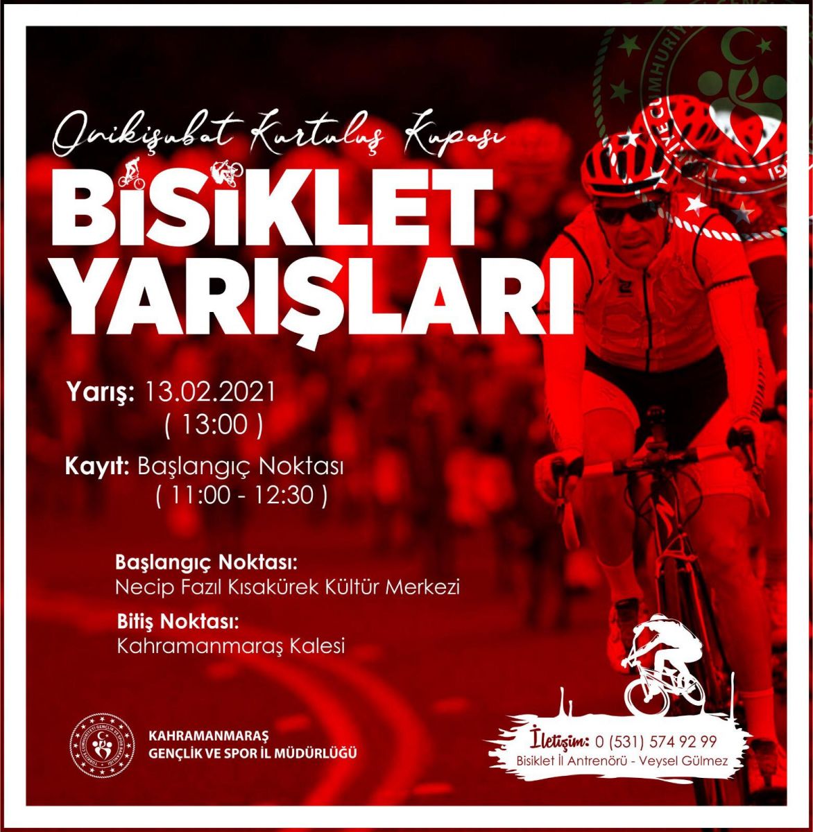Yarışlar 13 Şubat 2021 tarihi Saat 13:00 da Necip Fazıl Kısakürek Kültür Merkezinde Başlayıp Tarihi Kahramanmaraş Kalesinde bitiş yapılması planlanıyor.Yarışma Detayları:13 Şubat 2021 (11:00-12:30) saatlerinde Başlangıç noktasında kayıt yapılacaktır. Bütün bisiklet lisanslı sporcular katılabilecektir.Elit Erkekler ; 18 yaş ve Üzeri(lisansı yok ise müvafakatname imzalamak)Genç Erkekler 2003-2004Yıldız A Erkekler 2005-2006Yıldız B Erkekler 2007-2008-2009Genç Kızlar 2003-2006Yarışmaya katılacak tüm sporcuların Kask Takması zorunludur.