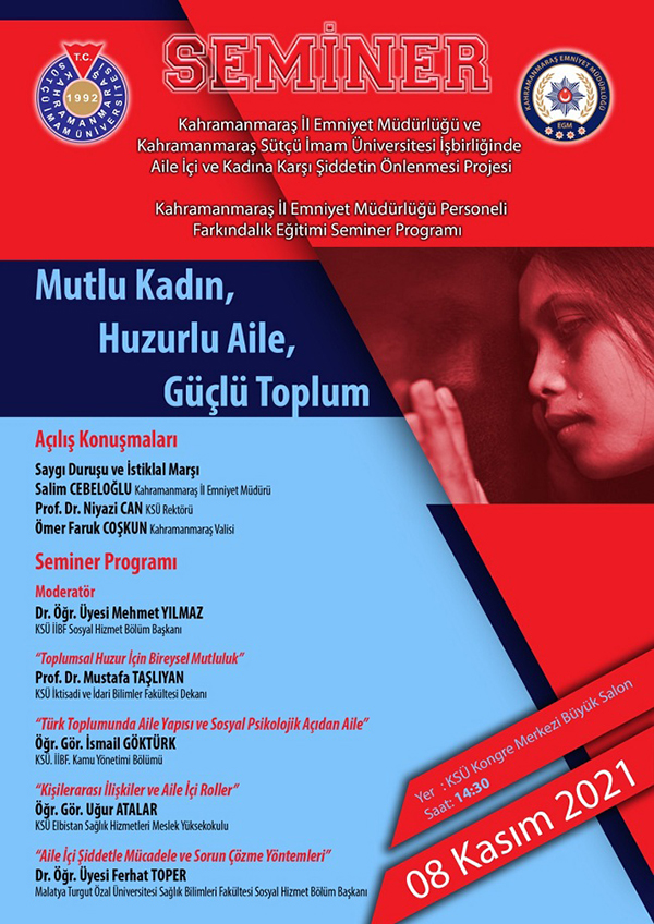 Toplum Destekli Polislik Şube Müdürlüğümüz koordinesinde yürütülmekte olan aile içi ve kadına yönelik şiddetin önlenmesi amacıyla hazırlanan “Mutlu Kadın, Huzurlu Aile, Güçlü Toplum Projesi” çalışmaları kapsamında projemizin 5. Aşaması olan İl Emniyet Müdürlüğü kadrosunda görevli polislerin farkındalık ve duyarlıklarını arttırmak amacıyla 08.11.2021 Pazartesi günü saat:14.30’da Kahramanmaraş Sütçü İmam Üniversitesi Avşar Yerleşkesi Bordo Kongre Merkezinde Valimiz Sayın Ömer Faruk COŞKUN, İl Emniyet Müdürümüz Sayın Salim CEBELOĞLU, KSÜ Rektörü Niyazi CAN ve İl Protokolünün katılımı ile program gerçekleştirilmiştir.