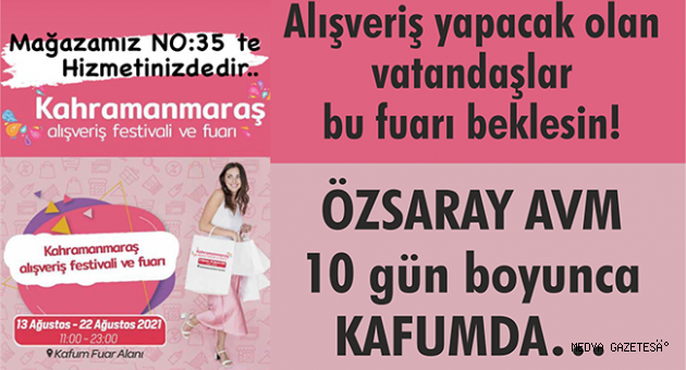 Fuar kültürünün kentte yeniden yaşatılması ve esnaflara katkı sağlamak amacıyla KAFUM’da 10 gün süreyle açık kalacak etkinlikte, züccaciye, hazır giyim, tuhafiye, ev tekstil ürünleri ve hediyelik sim sırma ile giyim ürünleri sergilenecek. KAFUM’da ÖZSARAY AVM’de yerini alıyor MAĞZAMIZ No: 35’te Tüm halkımızı bir çay içmeye bekleriz.