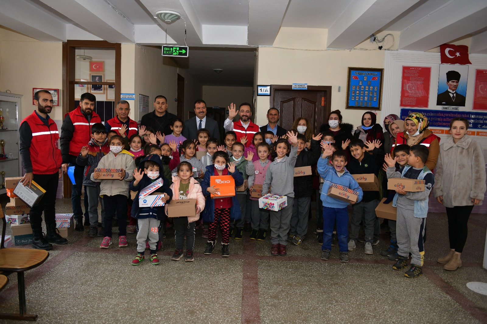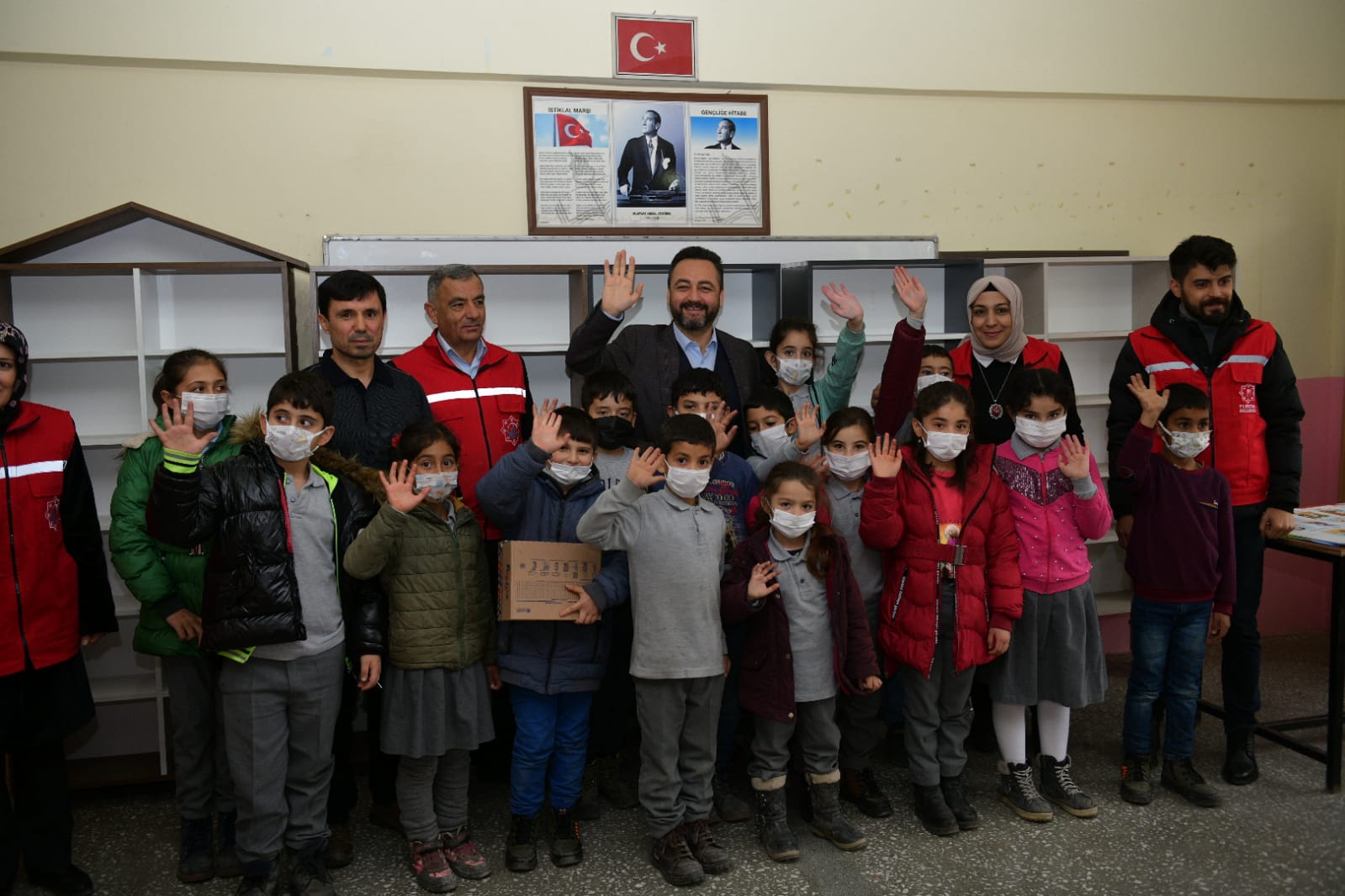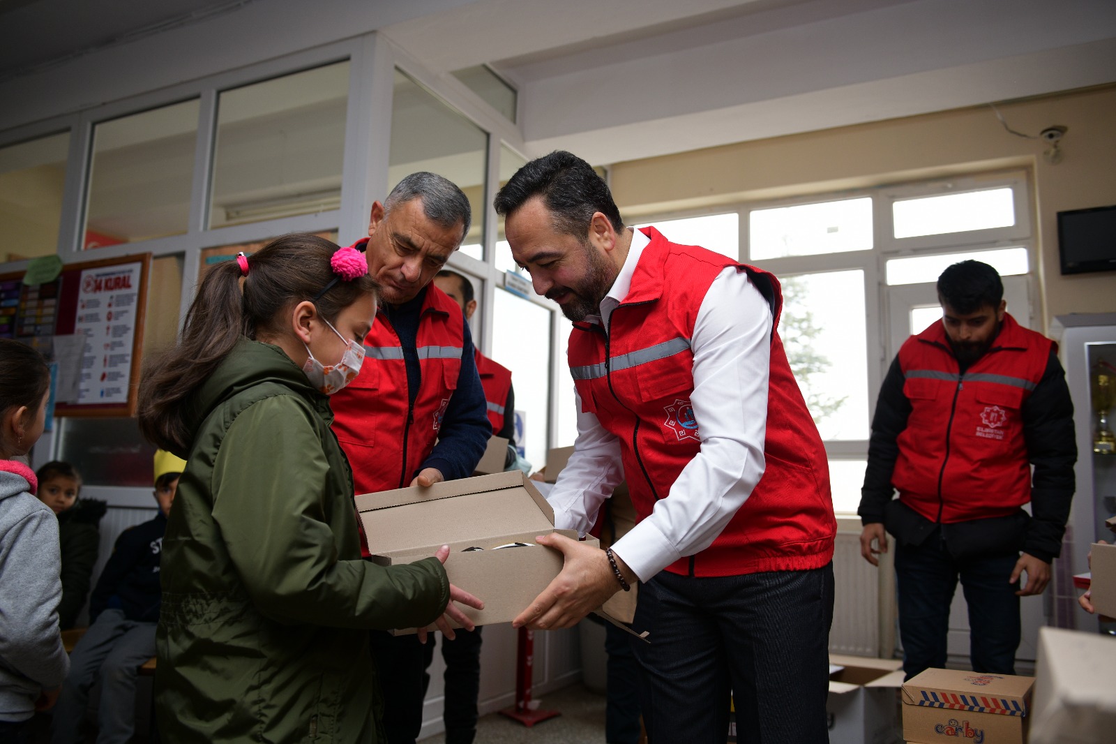 Platform gönüllüleriyle beraber okulları ziyaret eden Belediye Başkanı Mehmet Gürbüz öğrencilere bot ve monttan oluşan yeni yıl hediyesi verdi.
