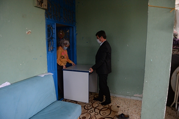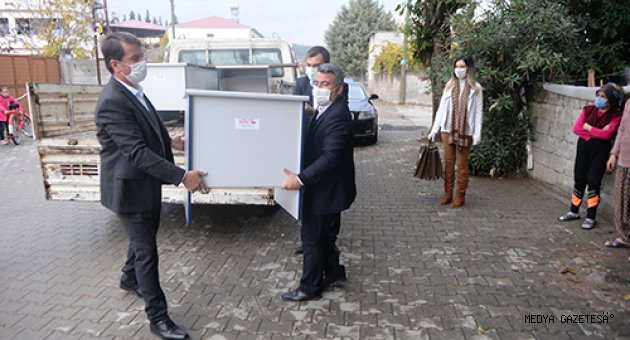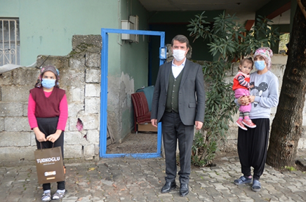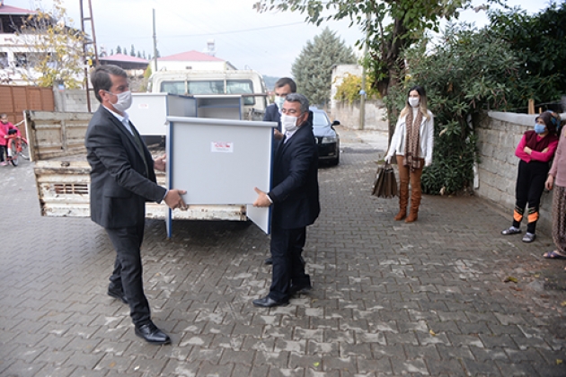 Okumuş, öğrencilere masanın yanı sıra kırtasiye seti de verdiklerini, ailelerine de gıda ve hijyen malzemesi yardımında bulunduklarını ifade ederek, şunları söyledi: