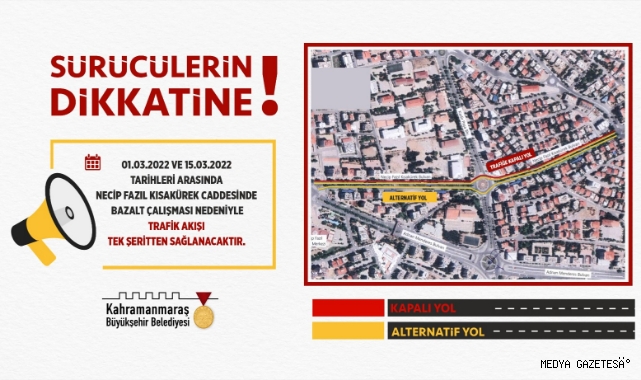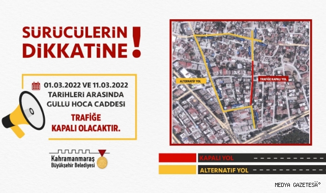 Ulaşım Hizmetleri Dairesi Başkanlığı’ndan yol kapama kararlarına ilişkin yapılan açıklamada, “Dulkadiroğlu İsa Divanlı Mahallesi’nde gerçekleştirilecek olan yol genişletme çalışmaları dolayısıyla bölgede farklı parsellerde yer alan 3 yapıda yıkım çalışmaları devam ediyor. Bu kapsamda, Güllü Hoca Caddesi’ndeki yolumuz 11 Mart tarihine kadar trafiğe kapatılmıştır. Yıkım ve hafriyat çalışmalarının tamamlanmasının ardından mevcut yol trafiğe açılacak. Onikişubat’ta Necip Fazıl Kısakürek Bulvarı’nda ise yol bakım ve onarım çalışmaları nedeniyle 15 Mart tarihine kadar trafik tek şeritten devam edecek. Vatandaşlarımızın trafikte aksaklık yaşamaması için alternatif güzergâhları kullanmaları önem arz etmektedir” ifadelerine yer verildi