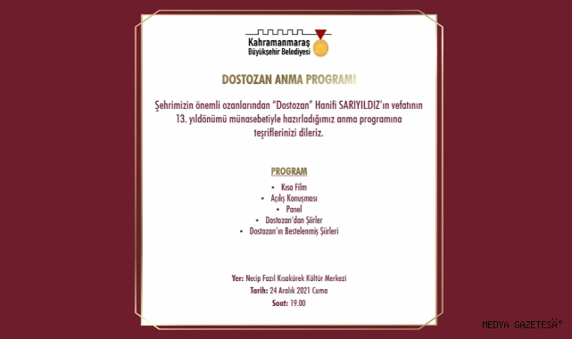 Kahramanmaraş Büyükşehir Belediyesi tarafından anlamlı bir program daha düzenleniyor. Şehrin önemli şair ve ozanlarından “Dostozan” adıyla eserler bırakan Hanifi Sarıyıldız için anma etkinliği gerçekleştirilecek. 24 Aralık Cuma günü (bugün) saat 19.00’da Necip Fazıl Kısakürek Kültür Merkezi’nde gerçekleştirilecek etkinlikte Dostozan; kısa film gösterimi, paneller, eserleri ve bestelenen şiirleriyle anılacak. Kültür Spor ve Turizm Daire Başkanlığı’ndan yapılan açıklamada tüm vatandaşların etkinliğe davet edildiği bildirildi.