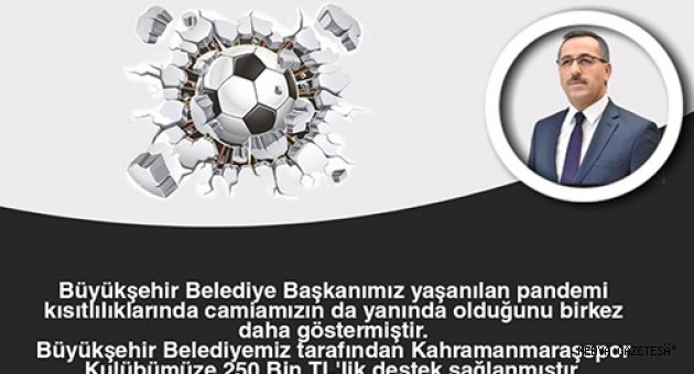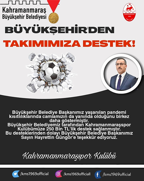 Kahramanmaraş Büyükşehir Belediye Başkanı Hayrettin Güngör, Kahramanmaraşspor’a 250 Bin TL’lik destek sağladı. Kulübün sosyal medya hesaplarından paylaşılan teşekkür mesajında, “Büyükşehir Belediye Başkanımız yaşanılan pandemi kısıtlılıklarında camiamızın da yanında olduğunu bir kez daha göstermiştir. Büyükşehir Belediyemiz tarafından kulübümüze 250 Bin TL’lik destek sağlanmıştır. Bu desteklerinden dolayı Büyükşehir Belediye Başkanımız Sayın Hayrettin Güngör’e teşekkür ediyoruz” ifadeleri kullanıldı.