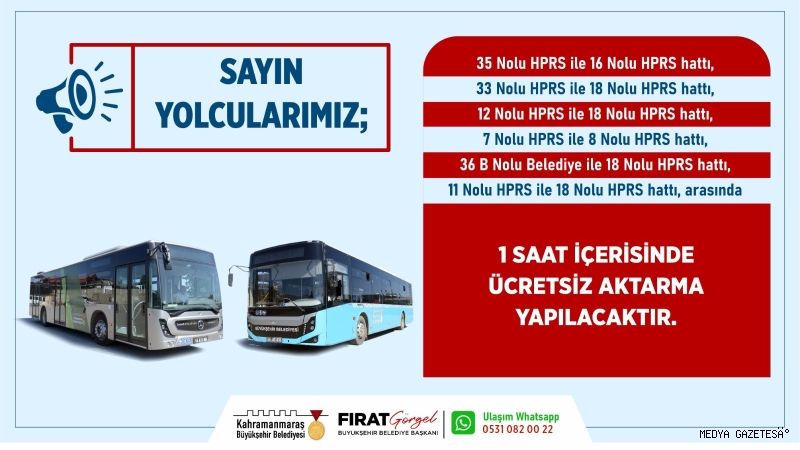 Şehir içi toplu taşıma standardını iyileştirerek vatandaşlara daha konforlu bir seyahat imkânı sunmak için faaliyetlerini artırarak sürdüren ve araç filosunu devamlı zenginleştiren Kahramanmaraş Büyükşehir Belediyesi, toplu ulaşımı daha uygun fiyatlarla sunmak için de gayretini sürdürüyor. Bu kapsamda önemli bir çalışma daha yapıldı. 35 numaralı hat ile 16 numaralı hat, 33 numaralı hat ile 18 numaralı hat, 12 numaralı hat ile 18 numaralı hat, 7 numaralı hat ile 8 numaralı hat, 36/B numaralı hat ile 18 numaralı hat, 11 numaralı hat ile de 18 numaralı hat arasında 1 saat içerisinde yapılacak aktarmalar ücretsiz olacak. Şehir içi toplu taşıma hizmeti veren otobüslerin güzergâh ve hareket saatlerine https://kahramanmaras.bel.tr/toplu-tasima-guzergah-ve-saatleri internet adresinden ve KahramanKart mobil uygulaması üzerinden ulaşılabiliyor. Büyükşehir Belediyesinden yapılan açıklamada, toplu ulaşım standardının artırılması noktasında yatırımların artarak devam ettiği belirtildi.