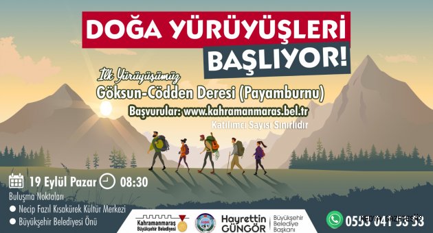 Büyükşehir Belediyesi Doğa Yürüyüşleri başlıyor. 19 Eylül Pazar günü Payamburnu mevkiinde gerçekleştirilecek ilk yürüyüş için www.kahramanmaras.bel.tr adresinden online başvuru yapılabiliyor.