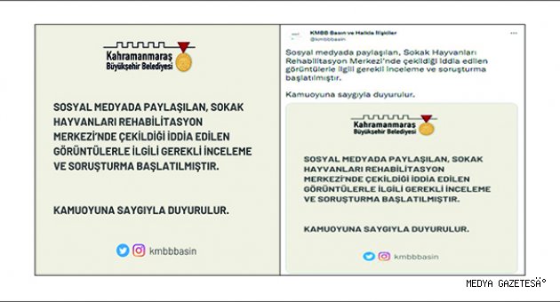 Kahramanmaraş Büyükşehir Belediyesi, sosyal medya hesaplarında paylaşılan, Sokak Hayvanları ve Rehabilitasyon Merkezi’nde çekildiği iddia edilen görüntülerle ilgili olarak bir açıklama yayımladı. Yapılan açıklamada şu ifadeler kullanıldı: “ Sosyal medyada paylaşılan, Sokak Hayvanları Rehabilitasyon Merkezi’nde çekildiği iddia edilen görüntülerle ilgili gerekli inceleme ve soruşturma başlatılmıştır. Kamuoyuna saygıyla duyurulur.”