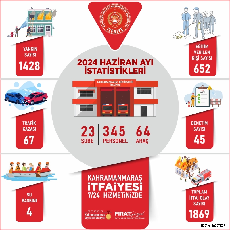 Büyükşehir Belediyesi İtfaiyesi, Haziran ayı içerisinde; bin 428 yangın, 67 trafik kazası, 4 su baskını ve bin 869 itfai olaya müdahalede bulundu. Vatandaşların afet ve acil durumlara karşı bilinç ve müdahale hızını artırmak için de toplam 652 kişiye eğitim verilerek tatbikat gerçekleştirildi. Her türlü afet ve acil durumda hızlı bir şekilde vatandaşların yardımına koşan, profesyonel kadrosu, modern araç ve ekipmanlarıyla itfai olaylara hızlı ve etkin bir şekilde müdahale ederek olası can ve mal kayıplarının önüne geçen Kahramanmaraş Büyükşehir Belediyesi İtfaiyesi, Haziran ayında da yangından trafik kazasına, su baskınından boğulma vakasına yüzlerce olaya anında müdahale etti. Büyükşehir Belediyesi İtfaiye Dairesi Başkanlığı, Haziran ayı içerisinde 23 şube, 64 araç ve 345 personelle; bin 428 yangın, 67 trafik kazası, 4 su baskını ve bin 869 itfai olaya müdahalede bulundu. Vatandaşların afet ve acil durumlara karşı bilinç ve müdahale hızını artırmak için de toplam 652 kişiye eğitim verilerek tatbikat gerçekleştirildi. İtfaiye Dairesi Başkanlığından yapılan açıklamada, “Profesyonel kadromuz, modern araç ve ekipmanlarımızla her türlü afet ve acil durumda vatandaşlarımızın yanındayız” ifadelerine yer verildi.
