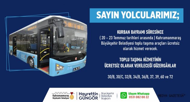 Kahramanmaraş Büyükşehir Belediyesi otobüsleri Kurban Bayramı süresince toplu taşıma hizmetini ücretsiz olarak verecek. 20 Temmuz Salı günü itibariyle ücretsiz olarak verilmeye başlanacak olan toplu taşıma hizmeti 23 Temmuz saat 23.59’a kadar devam edecek. Kurban Bayramı süresince toplu taşıma hizmetinin ücretsiz olarak verileceği hatlar; 30/B, 30/C, 32/B, 34/B, 36/B, 37, 39, 60 ve 72 olarak belirlendi. Ulaşım Hizmetleri Dairesi Başkanlığı’ndan yapılan açıklamada; Kurban Bayramı’nda çalışacak sefer saatlerine https://kahramanmaras.bel.tr/toplu-tasima-guzergah-ve-saatleri adresinden ulaşılabileceği veya 0531 082 00 22 numaralı “Ulaşım Whatsapp” hattı üzerinden bilgi alınabileceği ifade edildi.