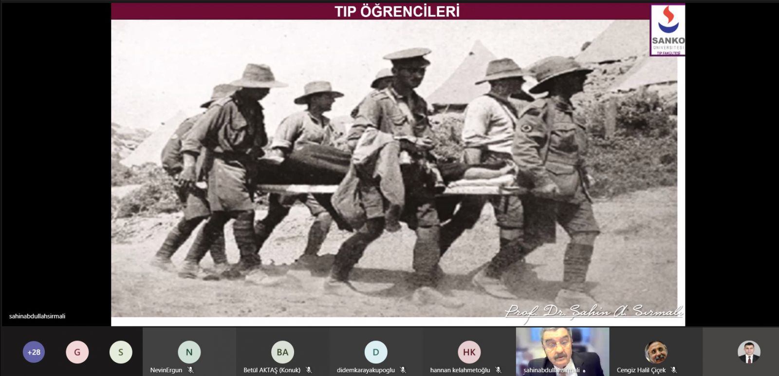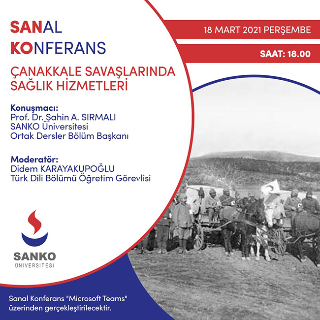 SANKO Üniversitesi’nde 18 Mart Çanakkale Zaferi ve Şehitleri Anma Günü nedeniyle Ortak Dersler Bölümü, Türk Dili Birimi Öğretim Görevlisi Didem Karayakupoğlu’nun danışmanlığını yaptığı Edebiyat Kulübü tarafından “Çanakkale Savaşlarında Sağlık Hizmetleri” konulu online konferans düzenlendi.Ortak Dersler Bölüm Başkanı Prof. Dr. Şahin Sırmalı’nın konuşmacı olarak katıldığı ve Öğretim Görevlisi Karayakupoğlu’nun yöneticiliğini yaptığı program, saygı duruşunda bulunulması ve İstiklal Marşı’nın okunması ile başladı.