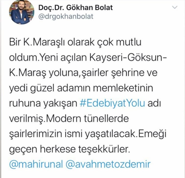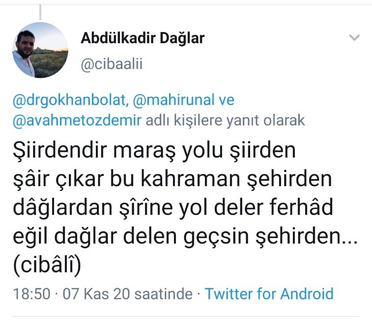 Cumhurbaşkanı Erdoğan'ın açıklamaları sonrası sosyal medyada gündem olan Edebiyat yolu ile ilgili Kahramanmaraşlı Akademisyen Gökhan Bolat'ta düşüncelerini paylaştı. Kayseri Erciyes Üniversitesinde kendisi gibi Akademisyen olan Doç. Dr. Abdülkadir Dağlar da Cibâlî mahlası ile Edebiyat yolu için bir dörtlük kaleme aldı.