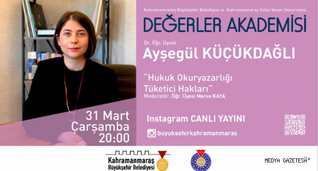Kahramanmaraş Büyükşehir Belediyesi ve Kahramanmaraş Sütçü İmam Üniversitesi işbirliği ile gerçekleştirilen Değerler Akademisi, 31 Mart Çarşamba günü Dr. Öğr. Üyesi Ayşegül Küçükdağlı’nın konuk olacağı programla devam edecek. Saat 20.00’da Büyükşehir Belediyesi Instagram hesabından canlı yayınlanacak programda, ‘Hukuk Okuryazarlığı’ üzerine konuşulacak. Dr. Öğr. Üyesi Selcan Kök moderatörlüğünde gerçekleştirilecek programda, temel hukuk teamülleri, kişi hakları, ailenin hukuki boyutu ve sorumlulukları gibi pek çok konu masaya yatırılacak.