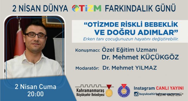 Kahramanmaraş Büyükşehir Belediyesi’nin Dünya Otizm Farkındalık Günü münasebetiyle 2 Nisan Cuma günü (yarın) saat 20.00’da gerçekleştireceği çevrimiçi programın konuğu Özel Eğitim Uzmanı Dr. Mehmet Küçükgöz olacak.