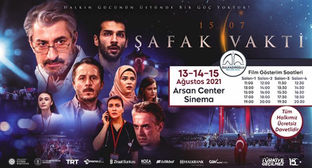 Milletin tarihe altın harflerle yazdığı 15 Temmuz destanını anlatan Şafak Vakti filmini vatandaşlarına ücretsiz olarak izletecek olan Dulkadiroğlu Belediyesi, 13-14-15 Ağustos tarihlerinde Arsan Sinemasında filmin gösterimde olacağını bildirdi.