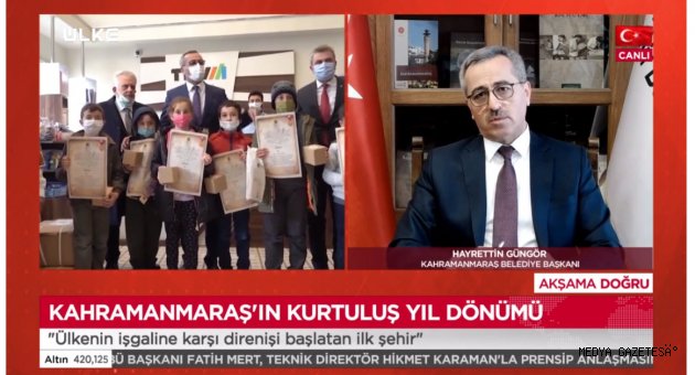 Kahramanmaraş Büyükşehir Belediye Başkanı Hayrettin Güngör, Ülke TV canlı yayınına katıldı. Ebru Kaçar’ın sunduğu Akşama Doğru programında milli mücadelenin 101. yıldönümü ile ilgili açıklamalarda bulunan Başkan Güngör, “101. yılını idrak ettiğimiz kurtuluşumuzu bu sene bütün dünyayı etkileyen pandemi sebebiyle, kısıtlılıklar çerçevesinde kutluyoruz. Bir hafta sürecek etkinliklerimizi dijital dünyaya taşıyarak vatandaşlarımızla buluşturuyoruz. Kurtuluş Haftamızı pandeminin bitmesiyle birlikte, hemşehrilerimizle birlikte geniş bir katılımla kutlayacağız” diye konuştu.