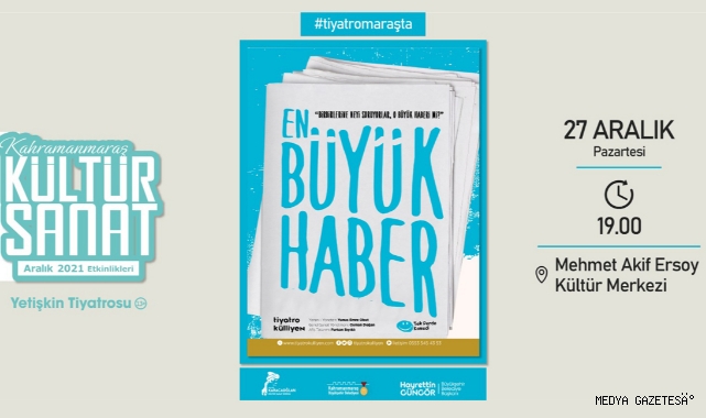 Kahramanmaraş Büyükşehir Belediyesi Aralık Kültür Sanat Etkinlikleri, hız kesmeden devam ediyor. Takvim kapsamında, bugün “En Büyük Haber” adlı tiyatro oyunu seyirciyle buluşacak. Mehmet Akif Ersoy Kültür Merkezi’nde 27 Aralık Pazartesi (bugün) saat 19.00’da gerçekleştirilecek etkinlikte, iflas etmiş bir fabrikatörün hikâyesi anlatılacak. İnanç ve bunalımın en çarpıcı örneklerinin sahneleneceği yetişkin oyununa, 13 yaş ve üzeri izleyiciler katılabilecek. Kültür Spor ve Turizm Daire Başkanlığı’ndan yapılan açıklamada ücretsiz etkinliğe biletsiz şekilde katılım sağlanabileceği bildirildi.