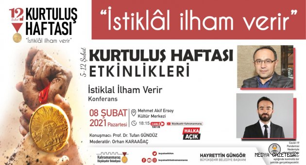 Kahramanmaraş Büyükşehir Belediyesi, 12 Şubat Kurtuluş Haftası Etkinlikleri tüm hızıyla devam ediyor. İnteraktif programlarla tarihçi ve yazarlar vatandaşlarla buluşturulurken, Mehter Takımı ve Abdal Halil Ağa’nın torunlarından oluşan ekip mahallelerde dinleti gerçekleştiriyor. 12 Şubat Kurtuluş Haftası etkinlikleri 8 Şubat Pazartesi günü saat 14.00’da hediye dağıtımı ile başlayacak. Ardından 18.15’te Orhan Karaağaç moderatörlüğünde, Araştırmacı Yazar Prof. Dr. Tufan Gündüz’ün katılımıyla ‘İstiklal İlham Verir’ konferansı gerçekleştirilecek. Mehmet Akif Ersoy Kültür Merkezi’nde, Büyükşehir Belediyesi sosyal medya hesaplarından canlı yayınlanacak etkinlik, pandemi tedbirleri çerçevesinde vatandaşlara da açık olacak. Etkinlikler kapsamında 20.00’da Mehteran Takımı ve davulcular mahalleleri dolaşmayı sürdürecekken, 21.00’da da Büyükşehir Belediyesi sosyal medya hesaplarından 100. yıla özel hazırlanan film gösterimi gerçekleştirilecek.