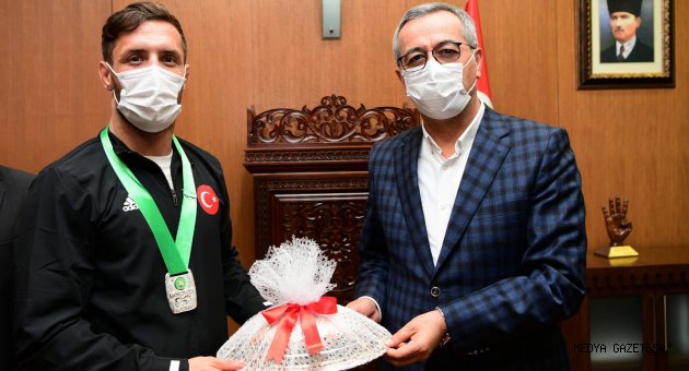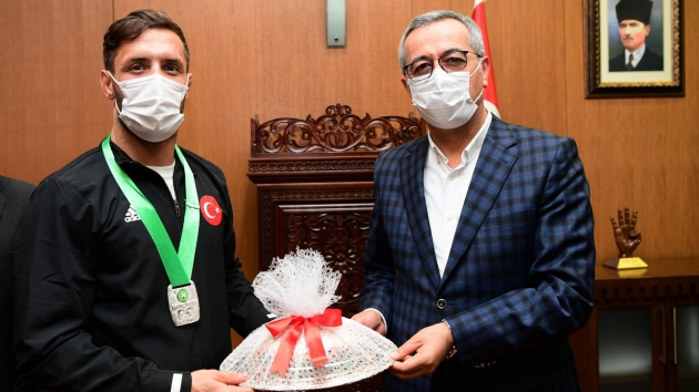 Dünya Güreş Şampiyonası’nda 2. olan Kahramanmaraşlı Milli Güreşçi Haydar Yavuz ile bir araya gelen Başkan Güngör, “Haydar Yavuz turnuvada gururumuz oldu. Sporcumuzu tebrik ediyor, başarılarının devamını diliyorum” dedi.