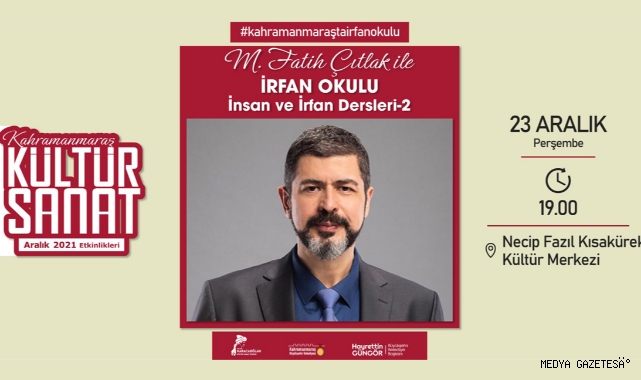 Kahramanmaraş Büyükşehir Belediyesi tarafından düzenlenen Aralık Kültür Sanat Sezonu etkinlikleri birbirinden ünlü isimleri ağırlamayı sürdürüyor. Takvim kapsamında, İlahiyatçı – Yazar M. Fatih Çıtlak, “İrfan Okulu” etkinliğinde ikinci dersle sevenleriyle bir araya gelecek. “İnsan ve İrfan” kavramlarının örnekler çerçevesinde farklı perspektiflerden anlaşılmaya çalışıldığı etkinlik, 23 Aralık Perşembe günü saat 18.00’da Necip Fazıl Kısakürek Kültür Merkezi’nde gerçekleştirilecek. Kültür Spor ve Turizm Dairesi Başkanlığı’ndan yapılan açıklamada etkinliğe tüm vatandaşların davet edildiği bildirildi.