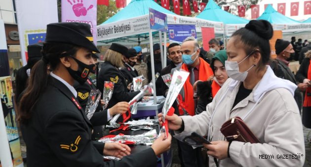 İl Jandarma Komutanlığı Aile İçi Şiddetle Mücadele ve Çocuk Kısım Amirliği ekipleri, ‘25 Kasım Kadına Şiddete Karşı Uluslararası Dayanışma Günü’ nedeniyle Demokrasi Meydanı ve Piazza Alışveriş Merkezi’nde stant açarak, günün anlam ve önemine binaen kadınlara karanfil, maske ve bilgilendirme broşürü dağıttı.