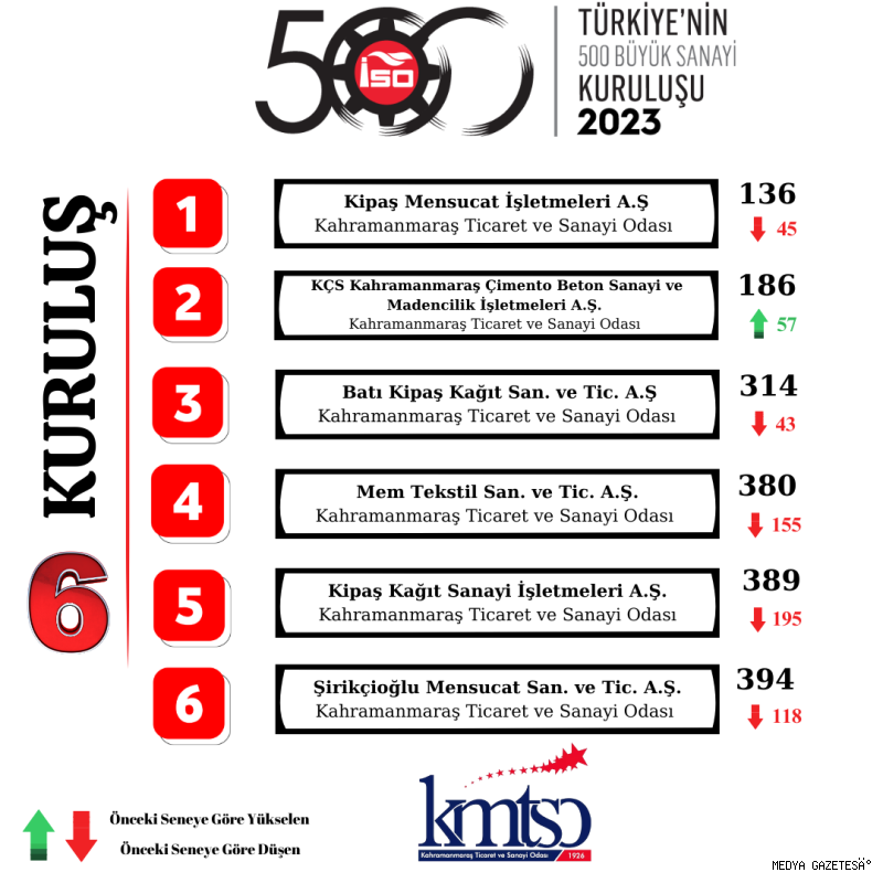 İstanbul Sanayi Odası (İSO) tarafından her yıl gerçekleştirilen "Türkiye'nin İlk 500 Büyük Sanayi Kuruluşu 2023" araştırma sonuçları açıklandı. Açıklanan listede Kahramanmaraş’tan 6 firma yer aldı. Sıralamaya giren firmaları kutlayan KMTSO Başkanı Mustafa Buluntu, “Geçtiğimiz yıl yaşadığımız deprem felaketine ve tüm güçlüklere rağmen şehrimiz, İSO'nun açıkladığı “Türkiye'nin İlk 500 Büyük Sanayi Kuruluşu 2023” listesinde 6 firma ile yer alarak üretim, istihdam ve ihracattaki gücünü ve direncini bir kez daha gösterdi. Bu sonuçlarla birlikte Kahramanmaraş; Sakarya, Balıkesir ve Samsun ile beraber Türkiye sıralamasında 15’inci sırayı paylaştı. Büyük afete rağmen geçtiğimiz yıl şehrimizden 1 milyar doların üzerinde ihracat yapıldı. Ülkemiz ve şehrimiz ekonomisine sağladıkları büyük katkılardan dolayı firmalarımızı tebrik ediyor, başarılarının devamını diliyorum. Böylesine önemli bir listede, ilk 500 büyük sanayi kuruluşu arasında 6 şirketimizle temsil ediliyor olmak Kahramanmaraş’ımız için çok önemli.” şeklinde konuştu.