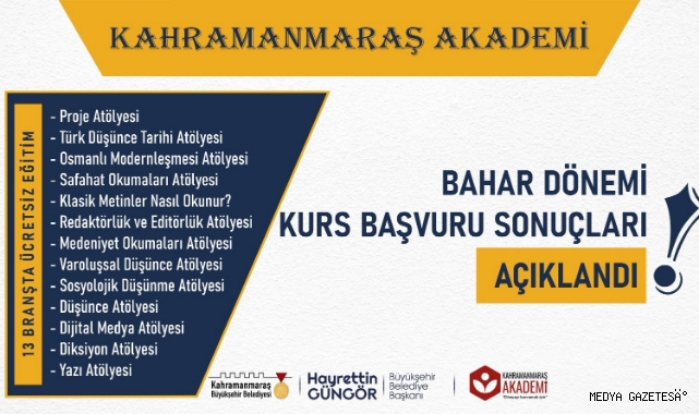 Kültür Spor ve Turizm Dairesi Başkanlığı tarafından yapılan açıklamada, “Büyükşehir Belediyesi Kahramanmaraş Akademi’de yeni bir döneme daha başladık. Başvurularda her dönem ciddi bir artış yaşanıyor. Vatandaşlarımızın bu ilgisi bizleri de memnun ediyor. Bahar Dönemi boyunca 13 farklı atölyede ücretsiz eğitimlerimiz olacak. Başvuru yapan herkese teşekkür ediyoruz” ifadeleri kullanıldı. Kahramanmaraş Akademi Bahar Dönemi, 23 Nisan Cumartesi günü sona erecek.