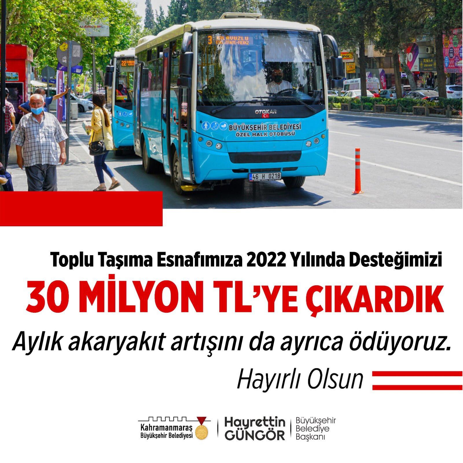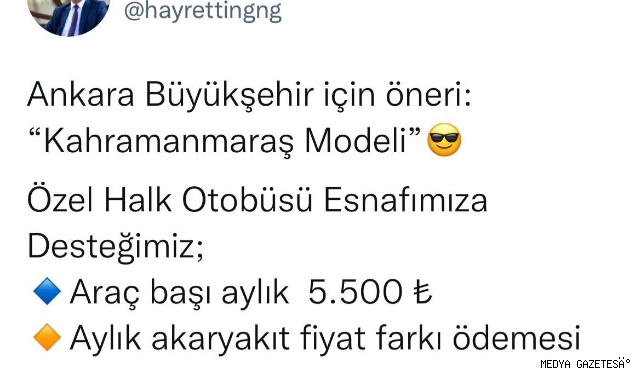 Ankara’da Özel Halk Otobüsü esnafının sefere çıkmayacağını açıklaması, ülke genelinde büyük yankı uyandırdı. Ankara Büyükşehir Belediye Başkanı Mansur Yavaş yaptığı açıklamayla vatandaşları özel araçlarını kullanmaya davet etti ve çözüm arayışlarının sürdüğünü belirtti. Pandemiden bu yana Kahramanmaraş’ta ise Özel Halk Otobüsü esnaflarına yönelik Türkiye’ye örnek bir uygulama sürdürülüyor. Büyükşehir Belediye Başkanı Hayrettin Güngör sosyal medyadan yaptığı paylaşımda, “Ankara Büyükşehir için çözüm Kahramanmaraş Modeli. Esnafımıza aylık 5 bin 500 TL destek sağlıyoruz. Bunun yanı sıra aylık akaryakıt fiyat farkı ödemesi de gerçekleştiriyoruz” ifadelerini kullandı.