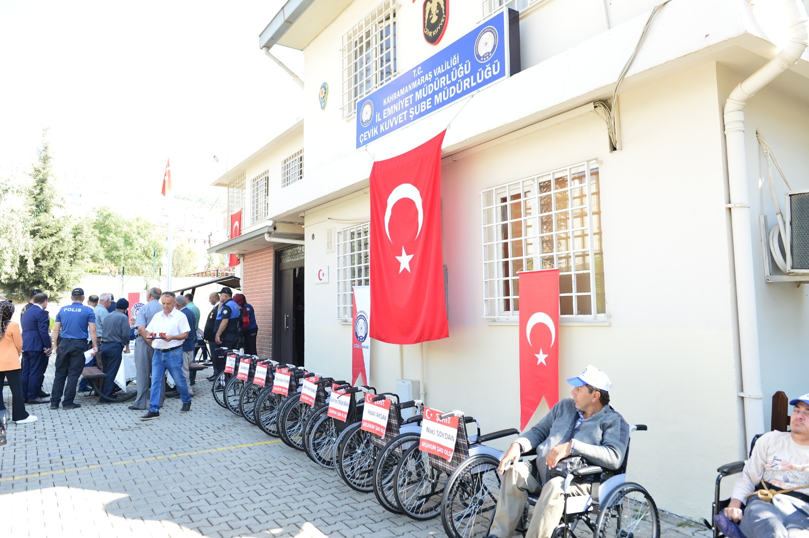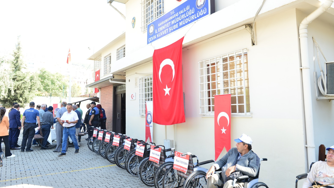 Kahramanmaraş Emniyet Müdürlüğü Çevik Kuvvet Şube Müdürlüğü'nce toplanan mavi kapaklarla alınan 10 adet tekerlekli sandalye engellilere dağıtıldı.