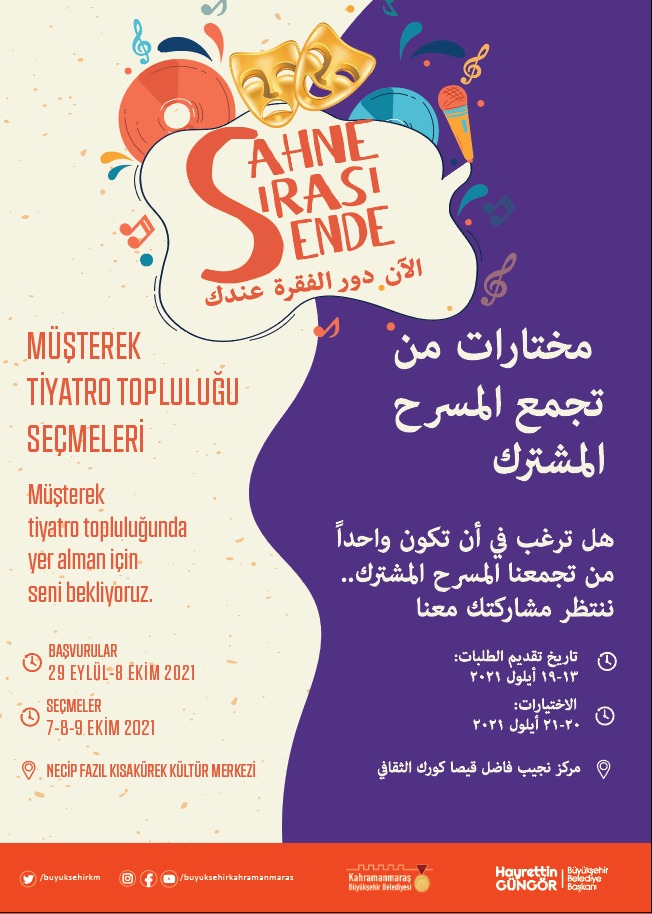 Büyükşehir Belediyesi’nin düzenlediği “Sahne Maraş Tiyatro Okulu” ve “Müşterek Tiyatro Topluluğu” yeni eğitim dönemine başlıyor. 29 Eylül - 8 Ekim tarihleri arasında NFK Kültür Merkezi’nde alınacak ön başvuruların ardından oyuncu adaylarıyla seçmeler düzenlenecek.