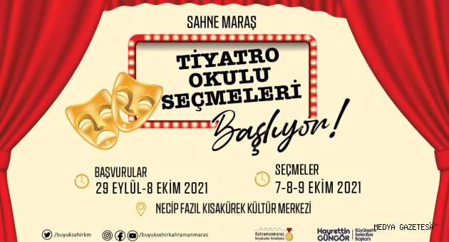 Kahramanmaraş Büyükşehir Belediyesi tarafından düzenlenen “Sahne Maraş Tiyatro Okulu” ve “Müşterek Tiyatro Topluluğu” yeni eğitim dönemine başlıyor. Ön başvuruları başlayan eğitimlere katılmak isteyen oyuncu adaylarının, Necip Fazıl Kısakürek Kültür Merkezi’nde yer alan başvuru noktasından form doldurmaları gerekiyor. Başvurular, 8 Ekim Cuma gününe kadar 08.00 ila 17.00 saatleri arasında yapılabilecek. Toplamda 8 hafta boyunca sürecek eğitimler ise 7-9 Ekim tarihlerinde gerçekleştirilecek seçmelerin ardından başlayacak. Uzman eğitmenler tarafından yaratıcı drama, duruş, diyafram - nefes gibi tiyatral eğitimlerin verileceği dersler ise yine Necip Fazıl Kısakürek Kültür Merkezi’nde verilecek.