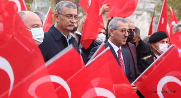 Konuşmasının devamında yaşanan olayın bağımsızlık yolunda önemine değinen Başkan Güngör, “Fransızların işgalinde işbirlikçi Ermeniler, özellikle de Hırlakyan’ın kızı dans etmek için Türk Bayrağı’nı bir sorun olarak görmüştü. Onu indirme cüretini göstermişlerdi. Ardından vaktine hazır olan Avukat Mehmet Ali Bey bir beyanname kaleme aldı. Buradaki yavrularımız yaşındaki oğlu Şahap ise genç yüreğinde yanan ateşle bu beyannameyi her yere astı. Ne diyordu o beyannamede, ‘Ey millet-i necibe-i Osmaniye vaktine hazır ol’. Kısa ve öz bu cümle her şeyi özetliyordu” diye konuştu.