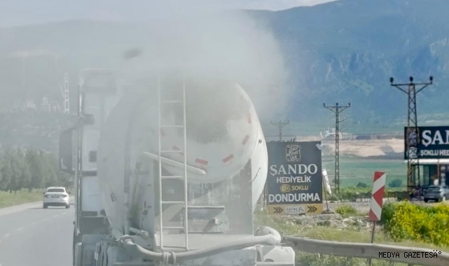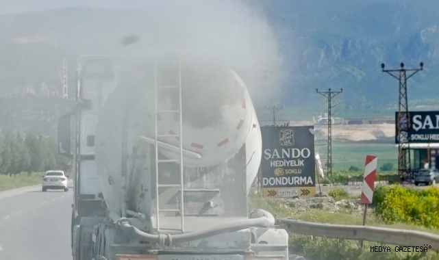 Kahramanmaraş-Gaziantep karayolu Narlı mevkiinde seyir halinde olan bir beton mikserinin arka kapağının açık olması nedeniyle yolda yoğun toz oluştu.