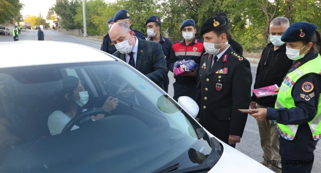 Vali Ömer Faruk Coşkun, emniyet kemeri denetimi sırasında sürücülere kampanyayla ilgili bilgilendirici broşür ve maske dağıtırken, araçlardaki çocuklara kırmızı düdük ve oyuncak hediyesinde bulundu.