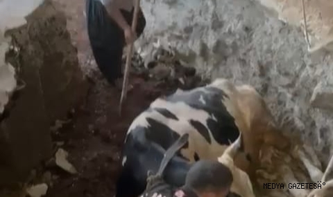 Kahramanmaraş'ta bodruma düşen inek kurtarıldı