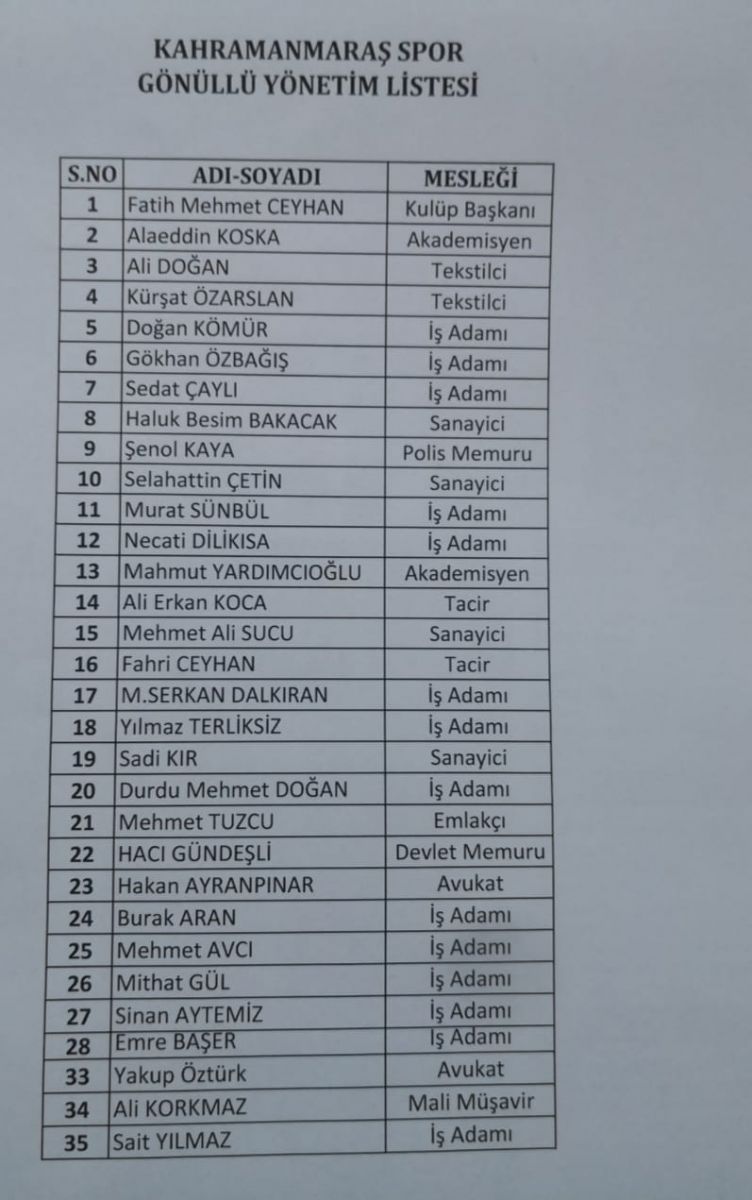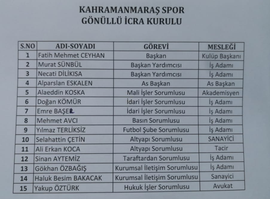 Kahramanmaraşspor'a düzenli bağış ve görev alarak destek verecek olan yaklaşık 35 kişilik yeni yönetimde İlk görevlendirmeler açıklandı.Kulüp tesislerinde yapılan basın açıklaması ile yeni yönetimde yer alan yönetimin görevleri ve isimleri açıklandı.