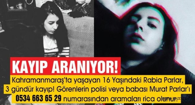 Alınan bilgiye göre, Turan Mahallesi'nde 3 gün önce ayrıldığı evine geri dönmeyen 16 yaşındaki Rabia Parlar'ın ailesi durumu Kahramanmaraş Emniyet Müdürlüğüne bildirdi.Polis ekipleri Parlar'ın bulunması için çalışma başlattı.