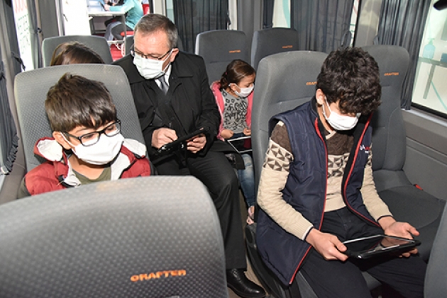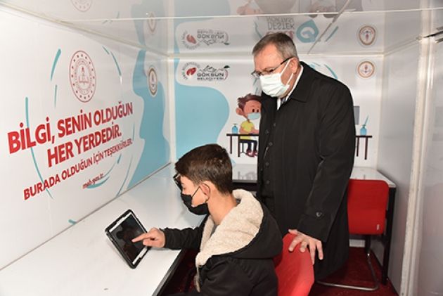 Göksun Belediye Başkanı Hüseyin Coşkun Aydın ve İlçe Milli Eğitim Müdürü Şeref Akpınar, internet erişimi olmayan bölgelerde kurulan (EBA) destek noktalarını inceleyerek yetkililerden bilgi aldı. Kırsal bölgede yaşayan öğrencilerin yapılan çalışmalarla fırsat eşitliği yakaladığını belirten Coşkun, pandemi sürecinde eğitimin aksamaması için bütün imkanları seferber ettiklerini söyledi.İnternet sorunu yaşayan bütün öğrencilere ulaşmaya çalıştıklarını dile getiren Aydın, şunları kaydetti:"Kovid-19 sürecinde öğrencilerimizin eğitimlerinden geri kalmaması için EBA destek noktaları ile katkı sağlamaya çalışıyoruz. Öğrencilerimizin eğitimini kesintisiz hale getirebilmek için İlçe Milli Eğitim Müdürlüğümüz ile koordinasyon içerisinde daha önce EBA Destek Noktası oluşturmuştuk. Şimdi de evinde interneti, bilgisayarı olmayan öğrenciler için mobil araçlar vasıtası ile bulundukları mahallede EBA erişimini sağlamaya çalışıyoruz. Ders saatlerine göre yapılan planlamalarla kesintisiz eğitimi sağlamaya gayret edeceğiz."İlçe Milli Eğitim Müdürü Şeref Akpınar da bu süreçte Göksun Belediyesinden önemli destek aldıklarını söyledi.Kırsalda internet erişim sorunu yaşayan öğrencilerin derslerinde geri kalmaması için mücadele ettiklerini belirten Akpınar, "Şu anda uzaktan eğitim sürecinden dolayı öğrencilerimize imkanlarımızı sunmaya çalışıyoruz. Öncelikle interneti olan okullarımızda EBA destek noktaları oluşturduk. Bunla beraber, Milli Eğitim Bakanlığımız belli bir plan doğrultusunda tablet dağıtıyor. Aynı zamanda bizler alternatifi çeşitlendirmeye çalışıyoruz. Hiç interneti olmayan yerlere, köylerimize de belediyemizle beraber iş birliği çerçevesinde mobil EBA araçları oluşturduk ve bu mobil EBA araçları ile EBA'yı öğrencilerimizin ayağına götürdük." diye konuştu.Muhtar Yaşar Aşkın da mobil EBA destek noktasının oluşturulmasıyla öğrencilerin canlı derslere katılabilmelerine imkan sağlayan Aydın ve Akpınar'a teşekkür etti.