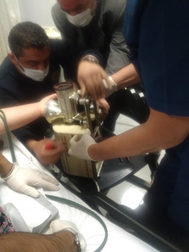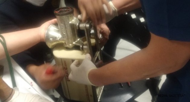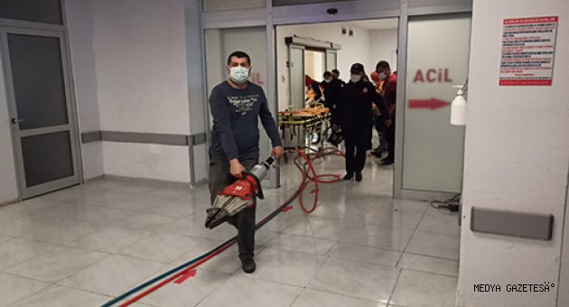 Hastanedeki sağlık görevlilerinin isteği üzerine hastaneye gelen itfaiye ekipleri, demir kesme aletleriyle kadının elini makineden kurtardı.