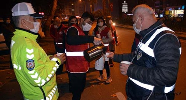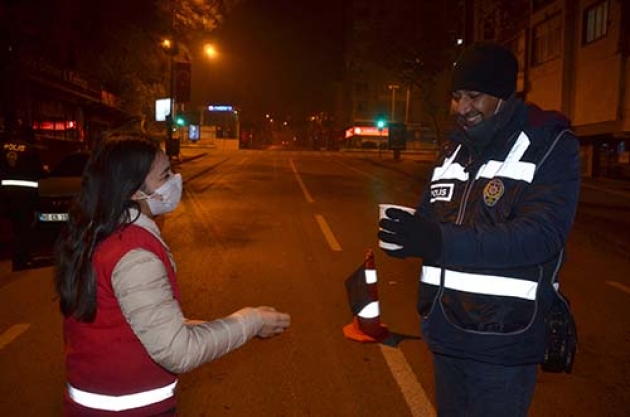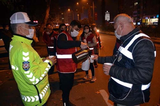Kahramanmaraş'ta Türk Kızılay ve Profesyonel Aşçılar Derneği tarafından sokağa çıkma kısıtlaması nedeniyle devriye görevi yürüten güvenlik güçlerine salep, çay, kahve ve çorba ikramında bulunuldu.
