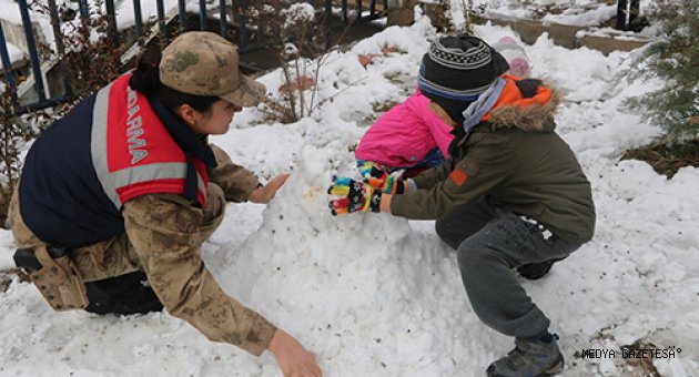 Kahramanmaraş'ta aralıklarla devam eden kar yağışı etkili olurken, jandarma ekipleri çocukların kar sevincine ortak oldu.