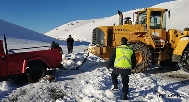 Devriye görevi yürüten jandarma ekipleri, içinde baba ve iki çocuğunun bulunduğu kamyonetin, Ahir Dağı Yedikuyular Kayak Merkezi mevkisinde kar ve tipiden dolayı mahsur kaldığını fark etti.Ekipler kara saplanan aracı, bölgeye çağırılan Büyükşehir Belediyesi'ne ait iş makinesi yardımıyla bulunduğu yerden çıkardı.Baba Tayfun Saygılı, kendilerine destek olan jandarma ve belediye ekiplerine teşekkür etti.Öte yandan, Göksun ilçesinde de aşırı kar yağışı sonrası yolların kapanması sonucu mahsur kalan çöp toplama aracında görevli belediye temizlik personeli de jandarma trafik ekiplerinin desteğiyle kurtarıldı.