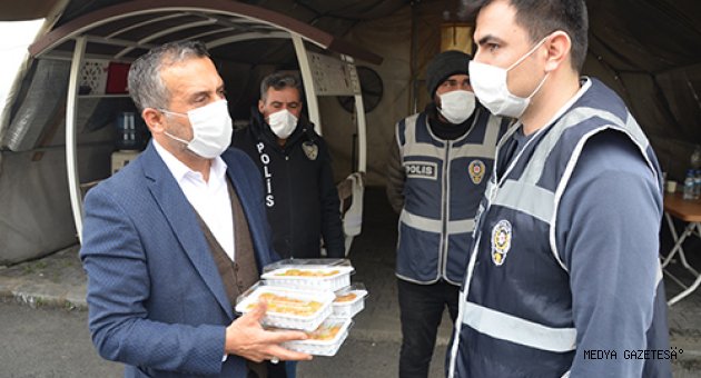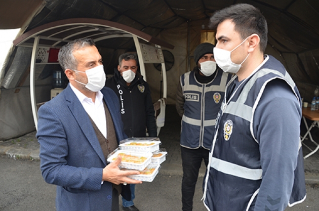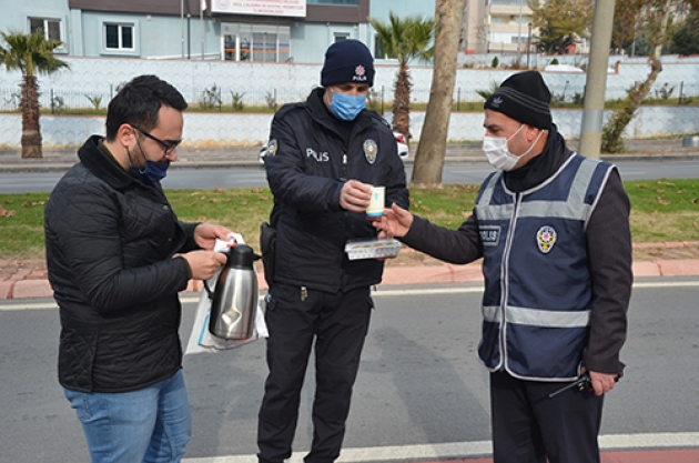Kahramanmaraş'ta Ziraat Odası Başkanlığı tarafından, yeni tip koronavirüs (Kovid-19) salgını nedeniyle alınan tedbirler kapsamında getirilen sokağa çıkma kısıtlamasında görevli polislere çay ve tatlı ikram edildi.