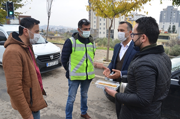 Merkez Dulkadiroğlu ve Onikişubat ilçelerindeki kavşaklarda, 56 saatlik sokağa çıkma kısıtlaması dolayısıyla görevli polis ekiplerini ziyaret eden Ziraat Odası Başkanı Mehmet Çetinkaya, çiftçiler adına tatlı ve çay ikramında bulundu.