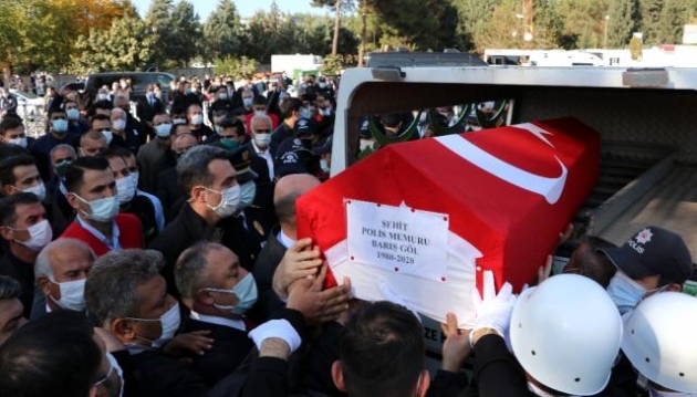 - Şehidin 9 ve 6 yaşlarındaki oğulları, babalarının cenaze namazında ön safta yer aldıKahramanmaraş'ta oteldeki cinayet zanlısını gözaltına almaya giden ekibe silahla ateş açılması sonucu şehit olan polis memuru Barış Göl'ün cenazesi memleketi Osmaniye'de toprağa verildi. Yakınları tarafından morgdan alınan Göl'ün cenazesi, Kazım Karabekir Mahallesi'ndeki baba evine getirildi.Burada helallik alınmasının ardından şehidin naaşı, cenaze töreninin yapılacağı Asri Mezarlık Kompleksi Camisi'ne getirildi. Törene şehidin yakınları, İçişleri Bakanı Süleyman Soylu, Emniyet Genel Müdürü Mehmet Aktaş, Osmaniye Valisi Erdinç Yılmaz, Belediye Başkanı Kadir Kara, Garnizon Komutanı Albay Hakan Yener Demirel, askeri ve mülki erkan ile vatandaşlar katıldı.Babası Osman Göl, "Oğlumun alnından öpmek istiyorum." diyerek şehidin tabutunu ve evladının fotoğrafını öperek gözyaşı döktü.Şehidin oğulları 9 yaşındaki Osman ile 6 yaşındaki Aras Kağan, babalarının tabutuna sarılarak fotoğrafını öptü.Bakan Soylu, şehidin babası, annesi, eşi ve çocuklarına taziyede bulunarak başsağlığı diledi.İl Müftüsü Ali Rıza Tahiroğlu'nun kıldırdığı cenaze namazında şehidin iki oğlu Bakan Soylu ile ön safta yer aldı.Kılınan namazın ardından şehit Barış Göl'ün cenazesi Asri Mezarlık'ta bulunan Garnizon Şehitliği'nde defnedildi.
