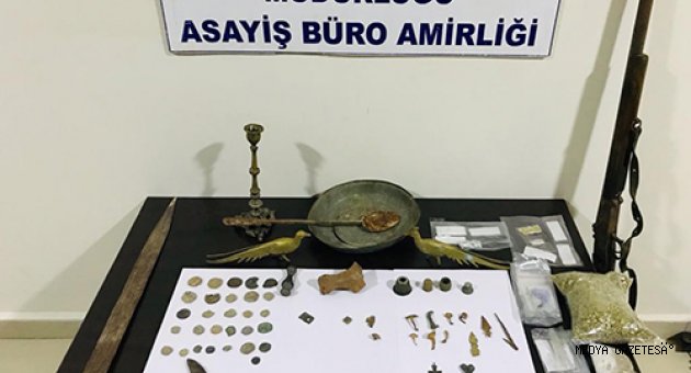 Afşin Cumhuriyet Savcılığı koordinesinde İlçe Emniyet Müdürlüğü ekiplerince, uyuşturucu sattığı iddia edilen ve çeşitli suçlardan sabıkası bulunan Fatih S'nin (37) Beyceğiz Mahallesi'ndeki evine operasyon düzenlendi.Evde yapılan aramada, 258 gram sentetik uyuşturucu ile ruhsatsız tüfek ve tarihi eser niteliği taşıdığı değerlendirilen 33 sikke, 9 broş, 2 bakır kuş figürü, 2 kılıç, taş hayvan figürü, şamdan, haç sembolü, kalp figürü, mızrak ucu, üzerinde Arapça yazılar bulunan taş ve 5 metal parça ele geçirildi.Operasyonda gözaltına alınan şüpheli, sağlık kontrolünün ardından ifadesi alınmak üzere emniyete götürüldü.