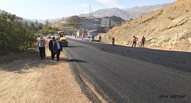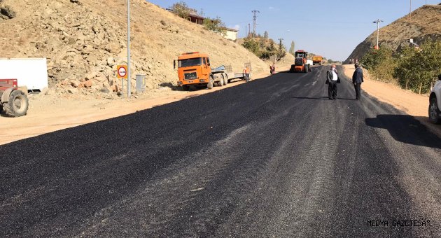 Kahramanmaraş'ın Çağlayancerit ilçesinde viraj kesme, eğim düzenleme ve bölünmüş yollarda sıcak asfalt çalışması yapılıyor.