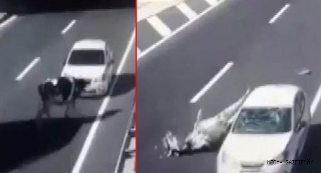 Plakası ve sürücüsünün kimliği henüz belirlenemeyen araç, merkez Onikişubat ilçesindeki Tekir Mahallesi'nde tünel çıkışında yola çıkan ineğe çarptı.Herhangi bir can kaybının yaşanmadığı kaza, bölgeden geçen bir aracın kamerasına yansıdı.Görüntülerde, otomobilin duramayarak ineğe çarpması ve hayvanın yola savrulması yer alıyor.