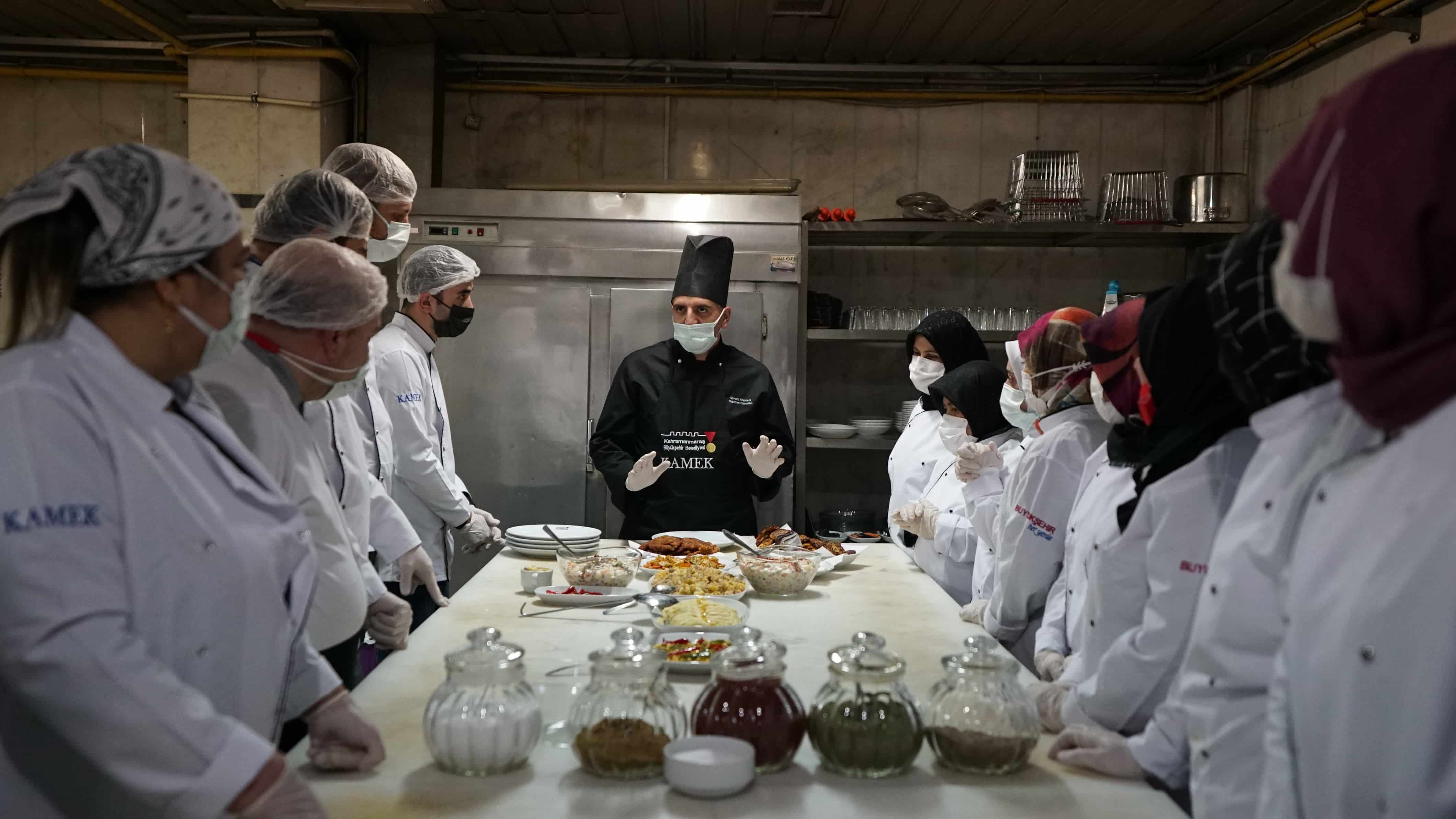 Kahramanmaraş Büyükşehir Belediyesi bünyesinde faaliyet gösteren Meslek Edindirme Kursları (KAMEK) yeni dönemde 16 branşta eğitimlerini sürdürüyor. Bu kapsamda KAMEK’teki atölyelerden Aşçı Yardımcılığı kursiyerleri mutfak eğitimleri için kolları sıvadı. Uzman eğitmenlerin gözetiminde teorik eğitimlerini tamamlayan 28 kursiyer, Büyükşehir Belediyesi’nin profesyonel mutfaklarında pratikte de birçok yeterlilik kazanıyor. Toplamda 5 ay sürecek eğitimleri başarıyla tamamlayan katılımcılara ise Milli Eğitim Bakanlığı onaylı sertifikaları verilecek. Şimdiye kadar toplamda 461 kişinin mezun olduğu Aşçı Yardımcılığı kursundan sertifika alan kursiyerler, eğitimlerdeki kazanımlarıyla çeşitli otellerde ve dünya mutfaklarında istihdam edilebiliyor.