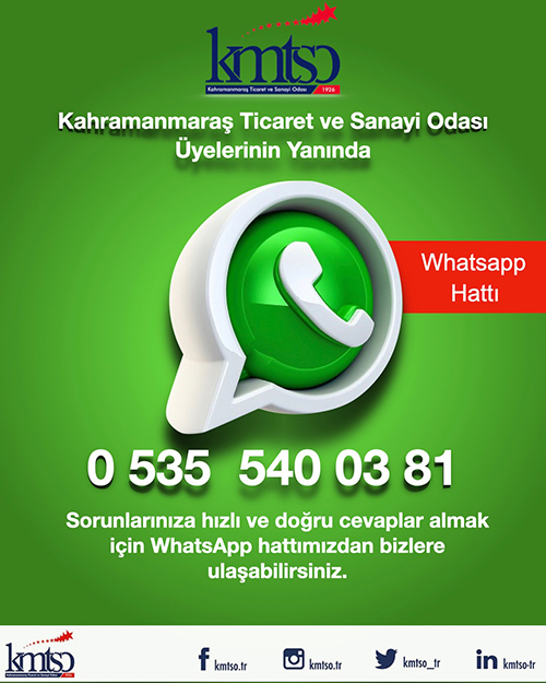 Üye şirketlerin kurumsal kapasitesinin güçlendirilmesi ve Kahramanmaraş’ın daha refah, daha modern, yaşam şartları yüksek bir kent olması ideali ile çalışan Kahramanmaraş Ticaret ve Sanayi Odası, yaklaşık 10 bin üye firmanın temsilciliğini üstlenerek, tüm ekonomik konularda üyelerine bilgi verme misyonunu sürdürüyor.Bütün dünyayı etkisi altına alan Covid-19 Koronavirüs pandemisi ile ilgili ülkeler ekonomik, sosyal ve siyasal anlamda mücadele ediyor.Pandemi dolayısı ile dünya genelinde olduğu gibi ülkemizin de ekonomide zor bir süreci yaşaması, firmaların soru ve sorunlara hızlı yanıt verilmesini zorunlu kılıyor. Kahramanmaraş Ticaret ve Sanayi Odası, üyelerinin sorunlarına daha hızlı cevap verebilmek için “KMTSO Whatsapp Danışma Hattı” oluşturdu. Bu sayede içinde bulunduğumuz süreç itibari ile üyelerinin sorunlarına hızlı, doğru ve güvenilir şekilde çözüm üretmeyi hedefliyor.Türkiye’nin üretim ve ihracat merkezlerinden birisi olan Kahramanmaraş hızlı bir şekilde toparlamaya devam etse de pandeminin etkisi üretici, tacir ve esnaf kesimini derinden etkiliyor.Kahramanmaraş Ticaret ve Sanayi Odası da pandeminin ekonomiye ve istihdama etkisinin azaltılması için gerek saha araştırmaları ile ekonominin ve iş dünyasının nabzını tutarak gerek sorunları ve talepleri ilgili bakanlıklara ileterek çözüm yolları geliştiriyor.Bu kapsamda, üyelerinin sorunlarına, talep ve görüşlerine daha hızlı ulaşmak için “KMTSO Whatsapp Danışma Hattı”nı kuran Kahramanmaraş Ticaret ve Sanayi Odası, kısa çalışma ödeneğine başvuruların hızlandırılması, Oda kaynaklarından oluşturulan nefes kredisi, vergi ve SGK erteleme ve yapılandırmaları gibi önem arz eden birçok konuda öncü rol üstlenmişti.