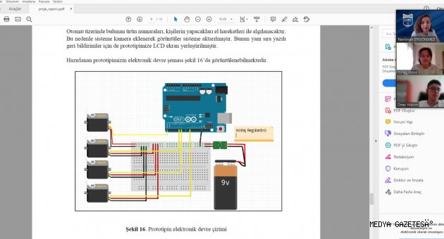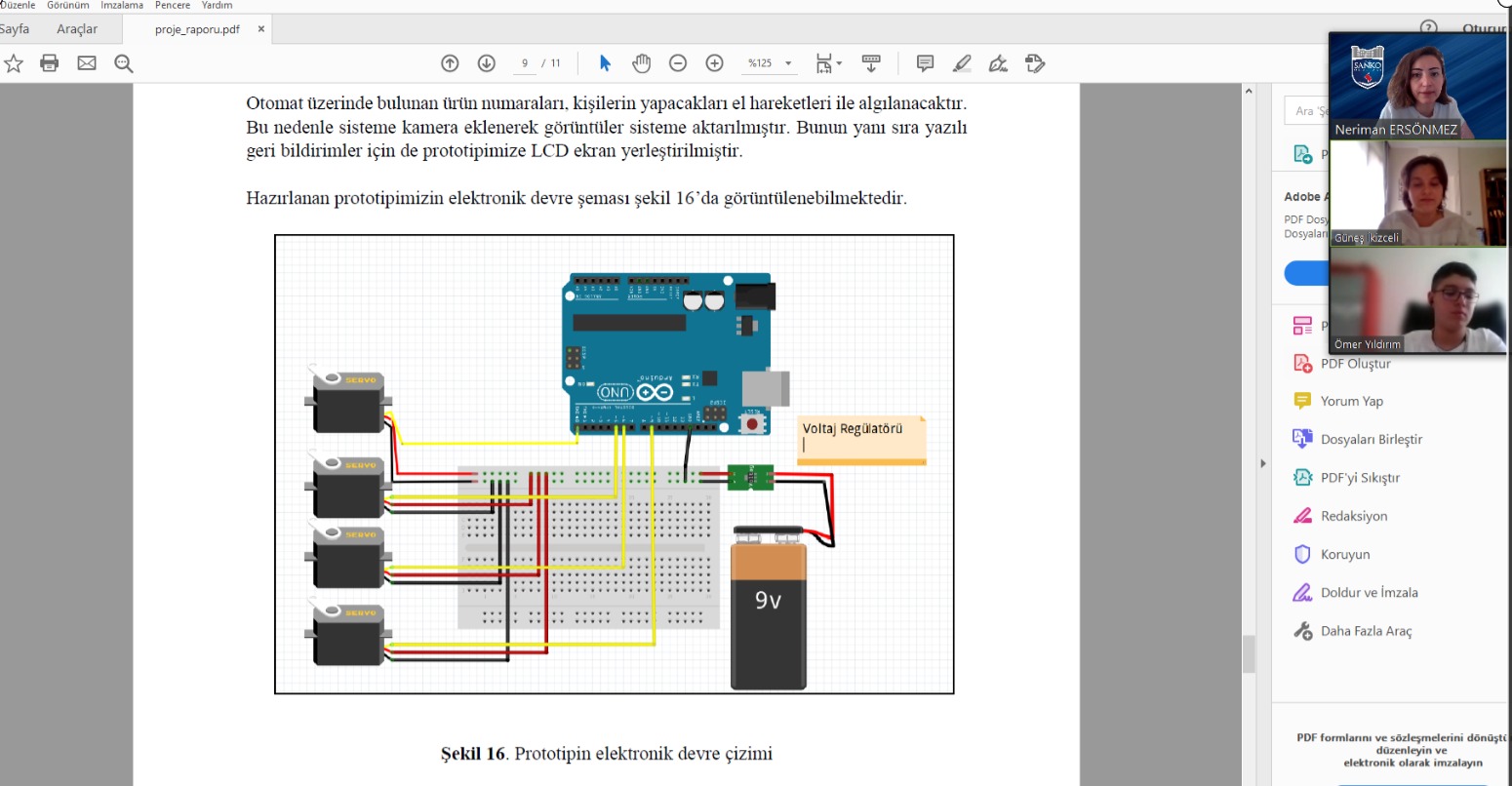 Öğrencilerden Güneş İkizceli ve Ömer Yıldırım ise proje danışman öğretmenleri Neriman Ersönmez rehberliğinde hazırladıkları “Temassız Akıllı Otomat Cihazı” isimli projeyle Türkiye ikinciliği kazandı.Projede, insanların birincil ihtiyacı olan gıda teminini gerçekleştirirken, toplu temas edilen yerlerde Covid-19 virüsünün bulaş riskini en aza indirmek için yapay zekâ destekli, tamamen temassız akıllı otomat cihazı tasarlandı.